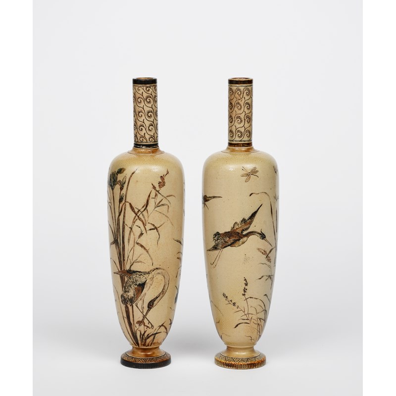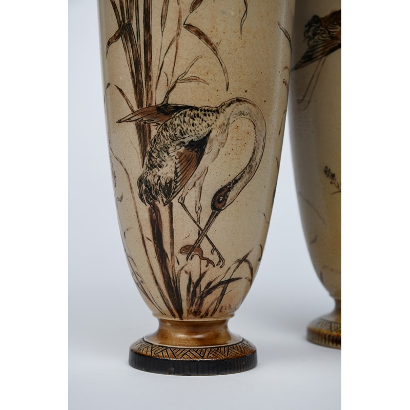 A tall pair of Martin Brothers stoneware Bird vases by Robert Wallace Martin, dated 1887, slender, shouldered form, incised with flying cranes over rushes and iris stems, one crane standing have caught a fish in its beak, glazed in shades of brown, highlighted with white on a buff ground, the cylindrical necks with scroll foliage pattern, incised 4-1887 R W Martin & Bros, London & Southall repaired damages to necks, 35.5cm. high, (2)