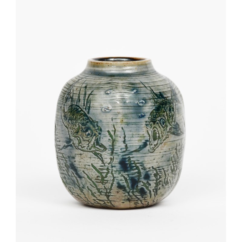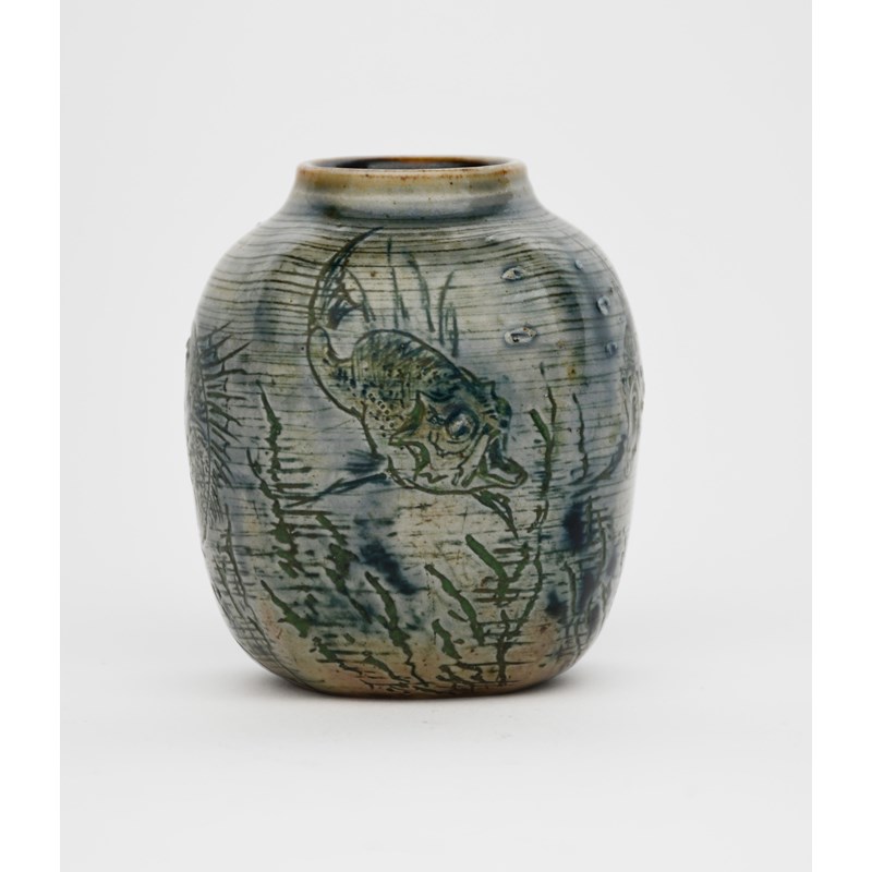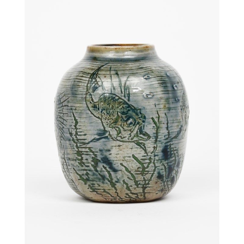 A Martin Brothers stoneware Aquatic vase by Edwin and Walter Martin, dated 1913, shouldered, ovoid form incised with scaly fish amongst waterweed, in green on a blue ground incised 6-1912 Martin Bros London & Southall, 7cm. high