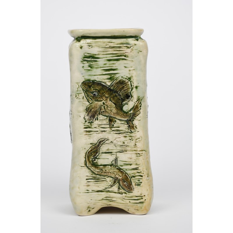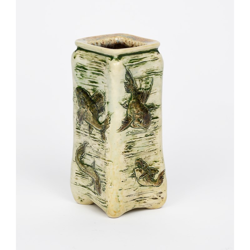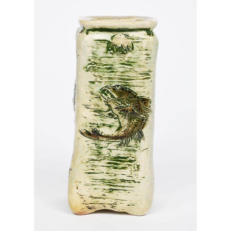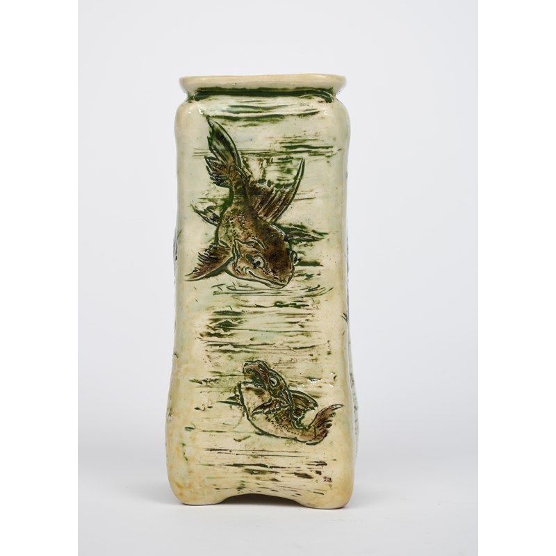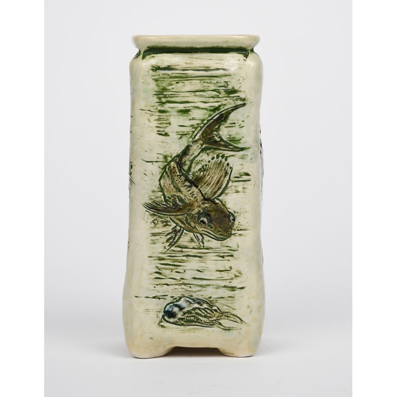 A Martin Brothers stoneware Aquatic vase by Edwin and Walter Martin, dated 1904, square section, the gourd like vase with pushed out fish and water creatures including an eel and two jelly fish, incised and painted in shades of green and brown on a buff ground to each side, incised 3-1904 Martin Bros London & Southall, 15.5cm. high