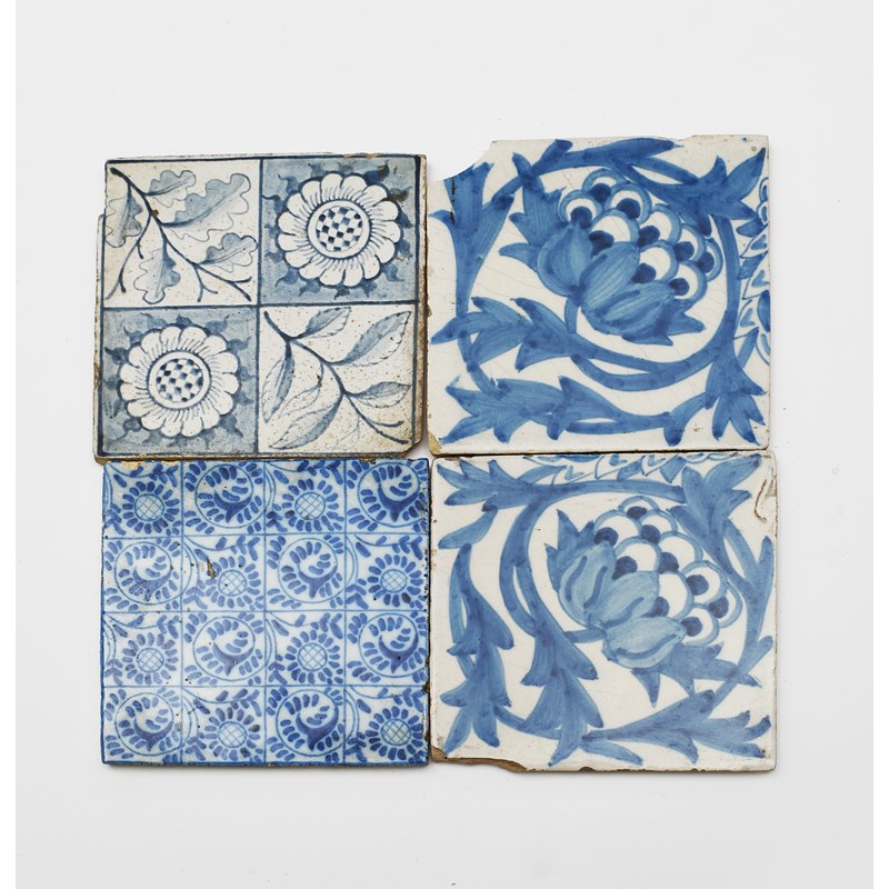 A Morris & Co Longden tin-glazed tile, painted with alternating flowers and foliage stems, in blue on a white ground, a 'Scroll' tile and two 'Artichoke' tiles unsigned, minor losses, 13cm. square (4)