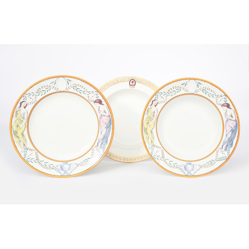 A pair of Wedgwood plates designed by Emile Lessore, printed to the rim with two classical females, in colours, and a Barnicott & Banfield 'Sydenham Crystal Palace soup bowl, printed with a coat of arms, impressed factory marks, 26cm. diam, (3)