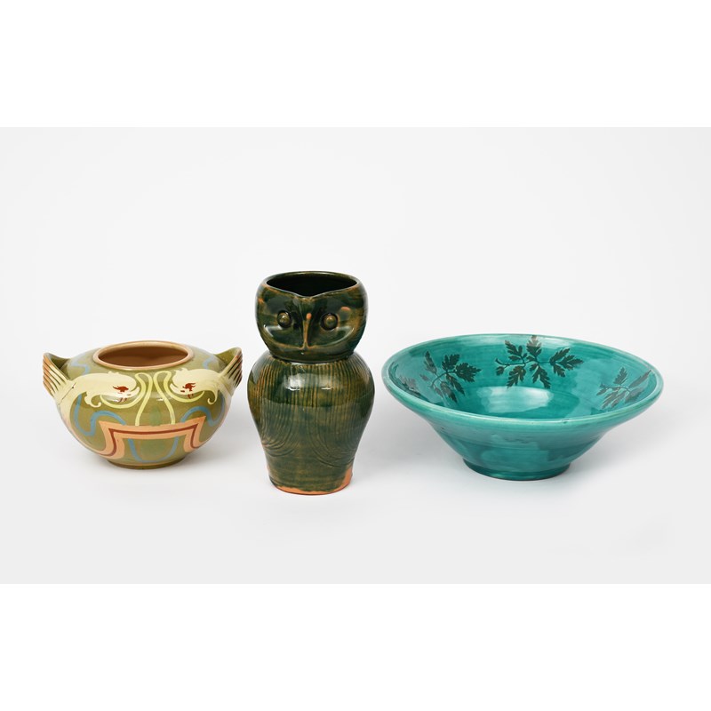 A Farnham Pottery owl jug, modelled as a stylised bird, covered in a green glaze, a Fishley Holland flaring bowl decorated to the interior with impressed leaf design and an Aller Vale dolphin bowl, main jug unsigned, 20cm. high, (3)