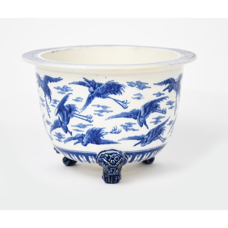 A Minton jardiniere the design attributed to Dr Christopher Dresser, shouldered form on three cast mask feet, printed in blue with cranes flying amongst small clouds impressed factory marks, 14cm. high