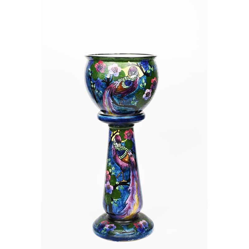 A Thomas Forester & Sons Trogon jardiniere and stand designed by Ronald Dean, ovoid bowl on flaring cylindrical jardiniere stand, each tube line decorated with a peacock, perched on a branch of stylised flowers and fruit, in colours on a blue ground, signed R Dean, 92cm. high, (2)