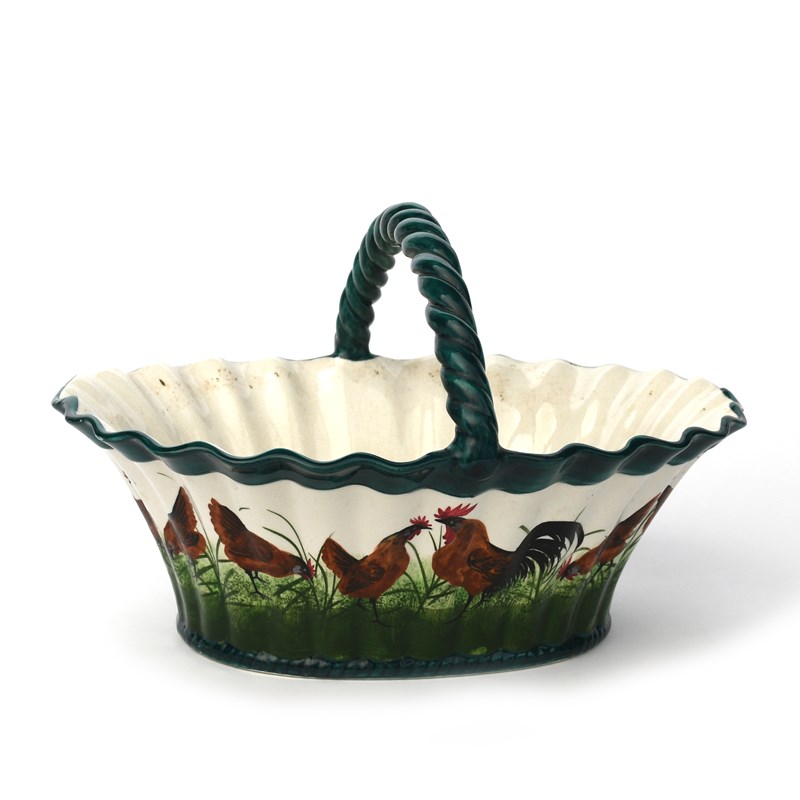 A large Wemyss Pottery egg basket retailed by Thomas Goode, flaring fluted form with rope-twist over-slung handle, painted with a frieze of brown chickens and a cockerel, in colours impressed Wemyss, printed Thomas Goode mark, 40.5cm. wide