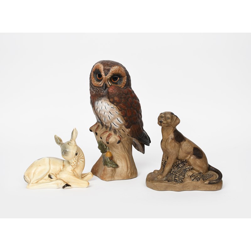 A Poole Pottery stoneware Barred Owl designed by Barbara Linley-Adams, model no. 705, glazed in matt colours, a Poole Pottery seated hound, model no,701 and a Poole Pottery Fawn resting by Marjorie Drawbell, impressed marks, 33cm. high (owl), (3)