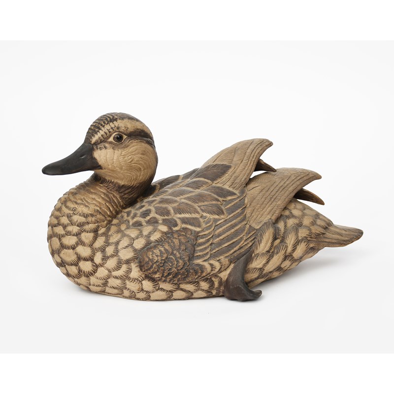 A Poole Pottery stoneware Mallard Duck designed by Barbara Linley-Adams, model no.707, introduced in 1973 in a limited edition of 1000, matt glazed with chestnut brown detailing, impressed marks, incised signature, 38cm. wide