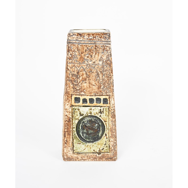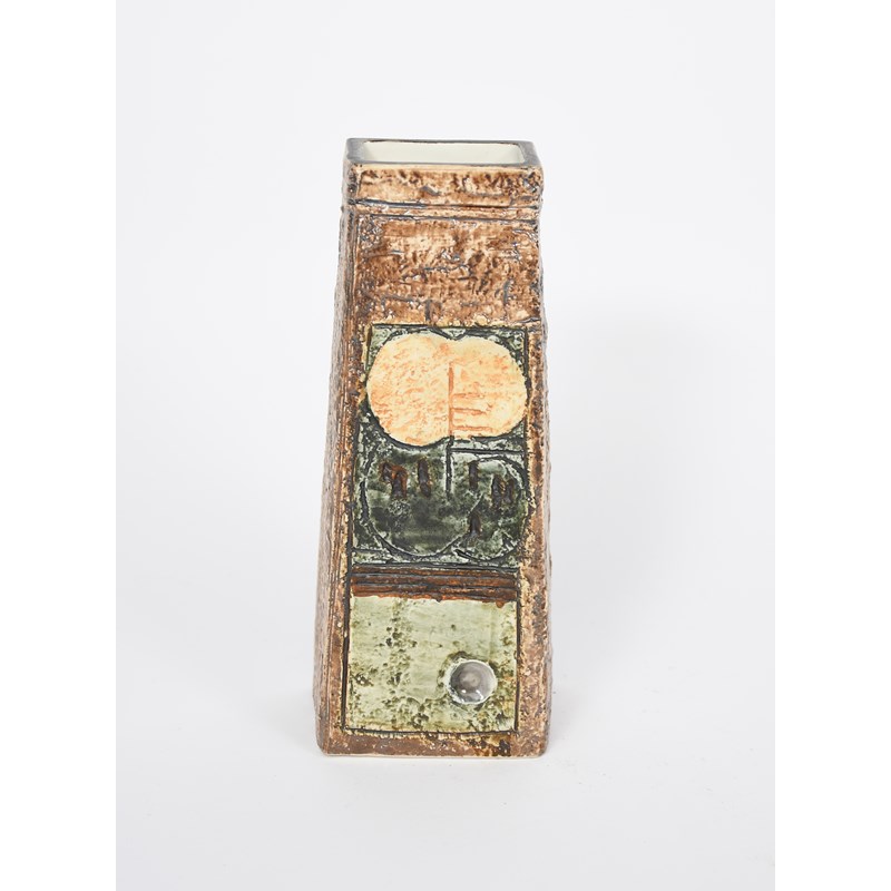 A Troika Pottery Coffin vase by Alison Brigden, tapering rectangular form, cast in low relief with geometric panels, glazed in shades of green and brown, painted factory mark, artist monogram, 17cm. high