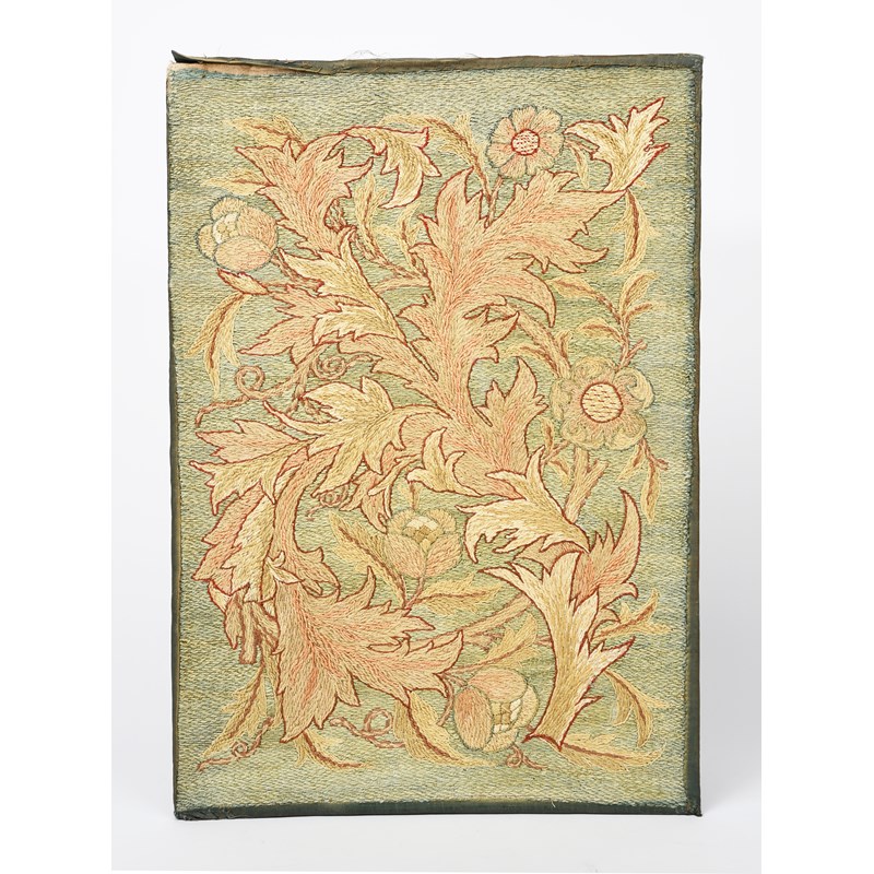 A Morris & Co silk embroidered panel, embroidered with scrolling foliage design, unsigned, 48 x 32.5cm.