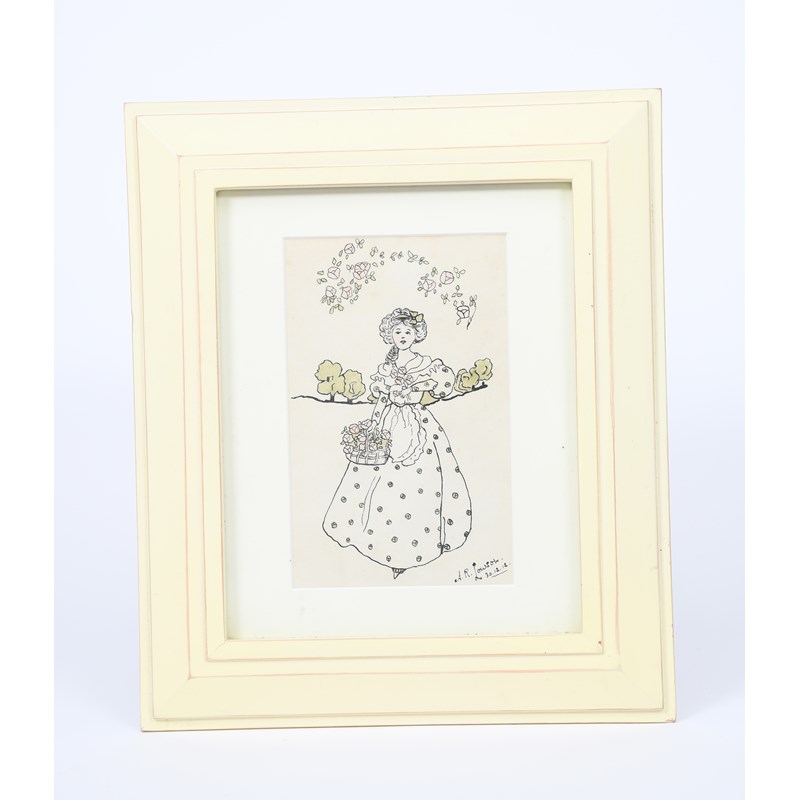 pen and ink on paper of a young lady walking before a row of trees, throwing Glasgow roses from her basket, , framed