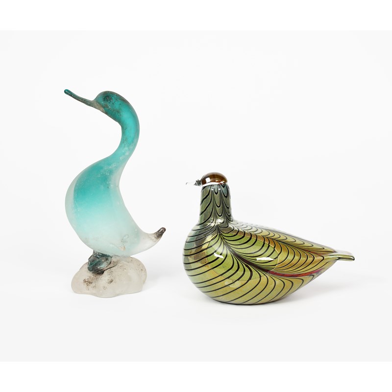 A Nuutajarvi glass bird designed by Oiva Toikka, red glass under pulled lustre surface, with applied clear glass head, and a frosted glass model of a duck signed Cenedese, etched marks, 20.5cm. wide, (2)