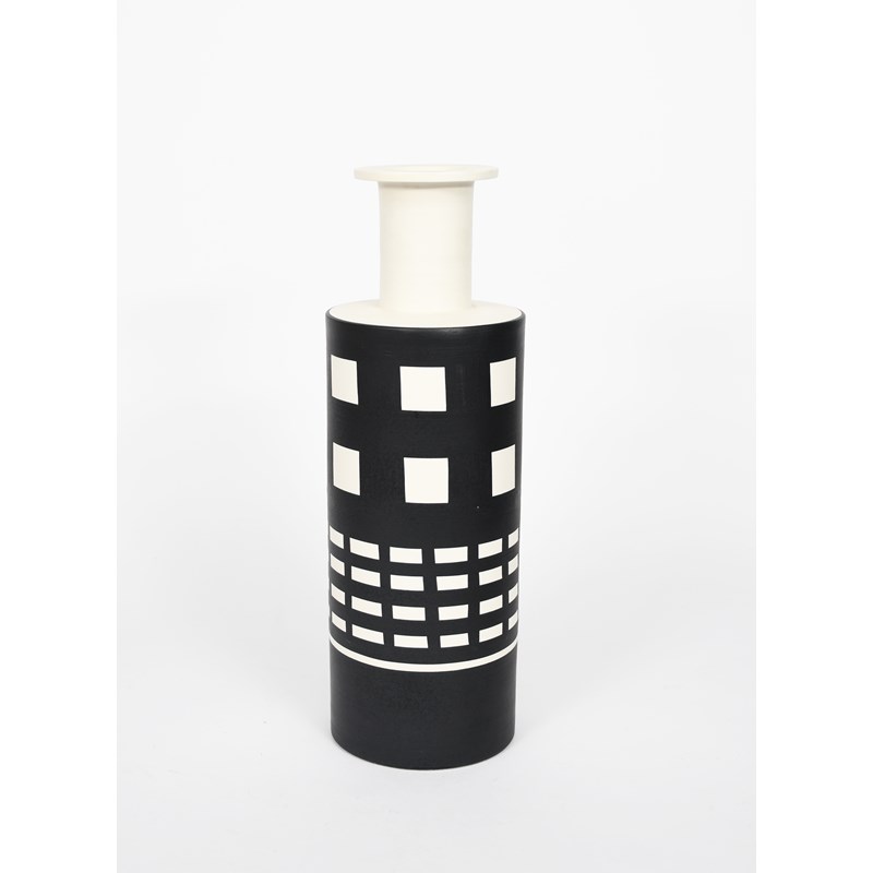 A Memphis Pottery Reel vase designed by Ettore Sottsass, shouldered, cylindrical form, screen printed in black and white, painted Sottsass 1986 to base, 45cm. high