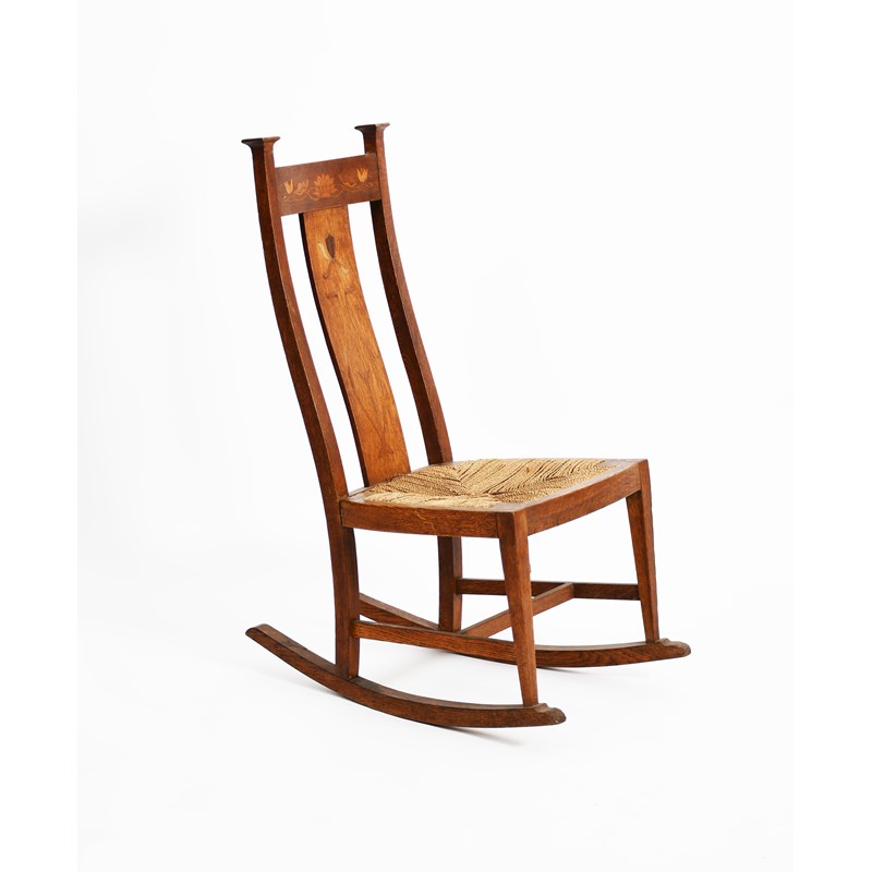 An oak rocking chair in the manner of George Montague Ellwood, with inlaid Art Nouveau flowers to the back splats, strung seat, unsigned, 101cm. high