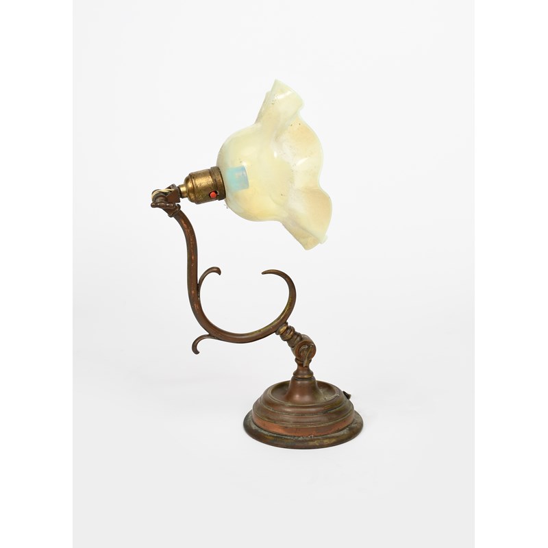 A brass wall or table lamp with vaseline glass shade, stepped domed base with scrolling, adjustable