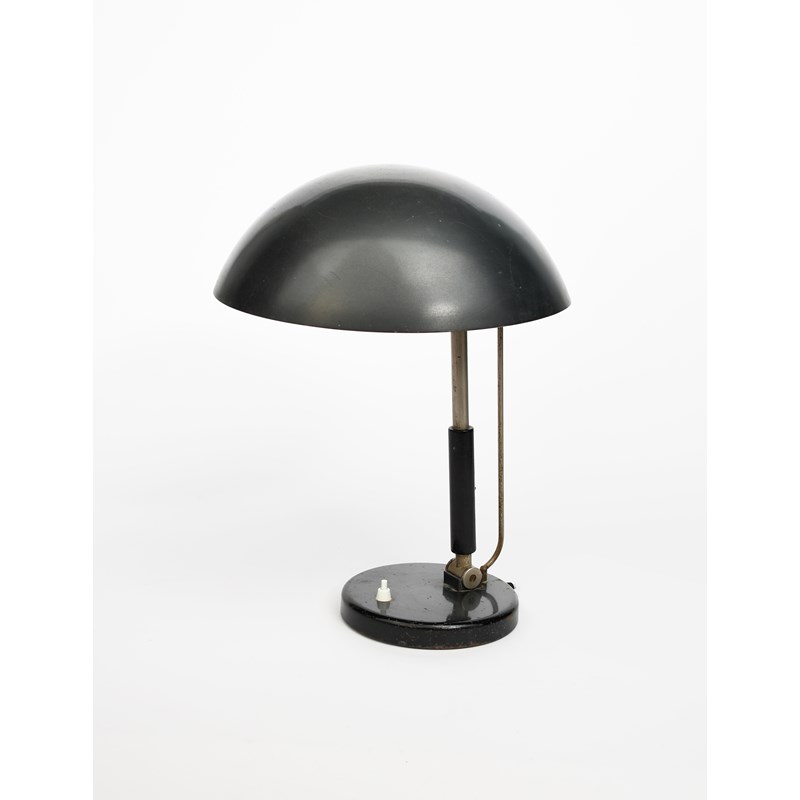 A Bauhaus style enamelled metal table lamp designed by Karl Trabert, on circular base, enamelled black, unsigned, 44cm. high