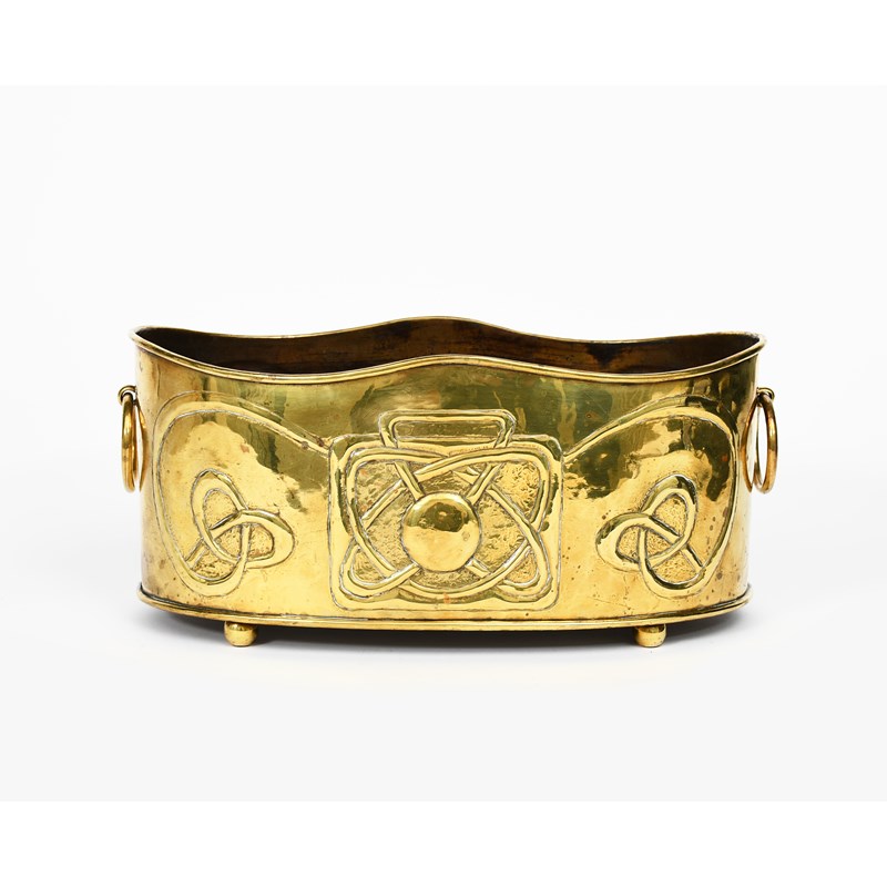 A Glasgow School brass planter, oval with twin loop handles, on four ball feet, stamped in low relief with Art Nouveau entrelac panels, unsigned, 38cm. wide