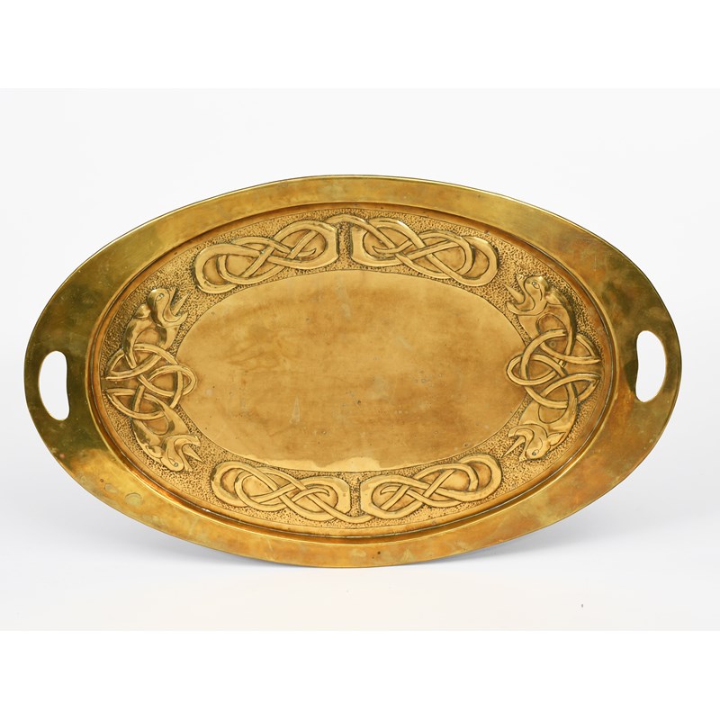 A Scottish Arts and Crafts brass tray probably Alexander Fisher of Iona, oval, twin-handled form, hammered in low relief with celtic knots with mythical beast terminals, on four ball feet, unsigned, 68.5cm. wide.