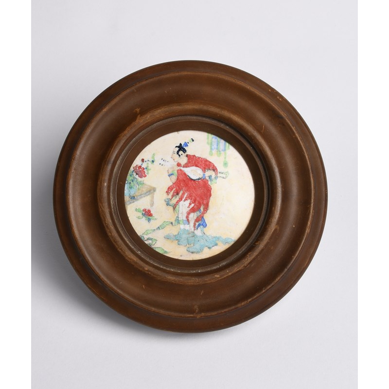 An enamelled metal roundel of a Japanese musician, depicting a man playing a stringed instrument, in bakelite frame, apparently unsigned, 13.5cm. diam. (frame)