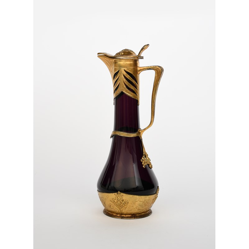 An Art Nouveau Osiris gilt metal and glass claret jug, model no.502, cast in low relief with panels of fruiting grape vine, stamped marks 31cm. high