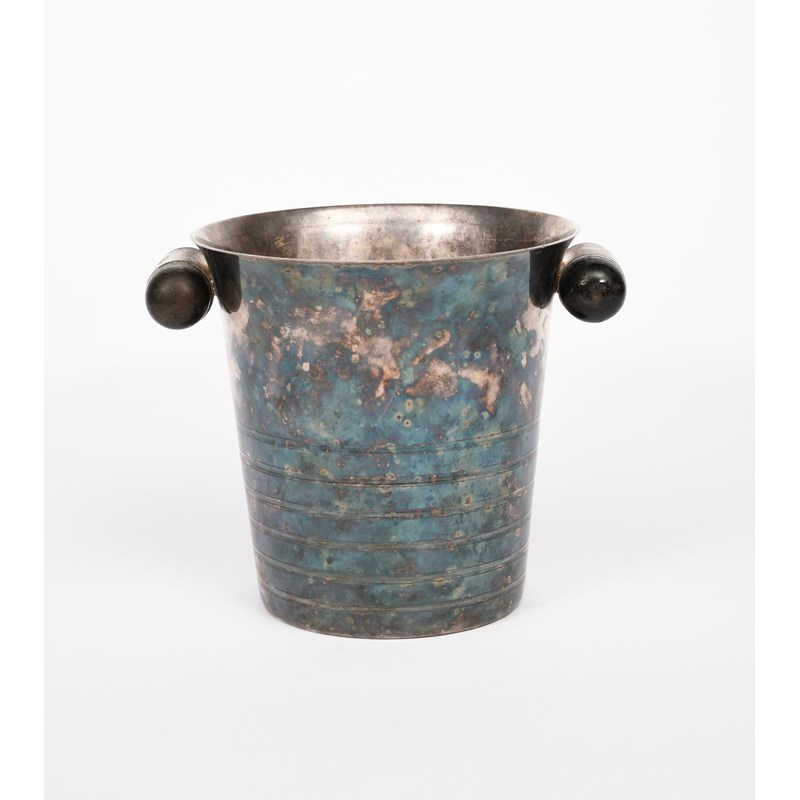 An electroplated wine cooler or ice bucket probably Christofle, flaring cylindrical form with streamlined wood handles, worn stamped makers mark to base, 20.5cm. high