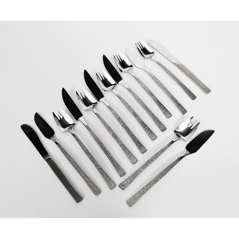 A Viners Studio stainless steel canteen of cutlery designed by Gerald Benney, comprising; six dinner forks and twelve knives, twelve dessert spoons and forks, twelve soup spoons, twelve teaspoons, twelve coffee spoons, four serving spoons, thirteen various butter knives, twelve various fish knives, six forks, seventeen various forks, six cake forks, six spoons, eleven small spoons, and a cake slice stamped marks, 19cm long (slice), (a lot)