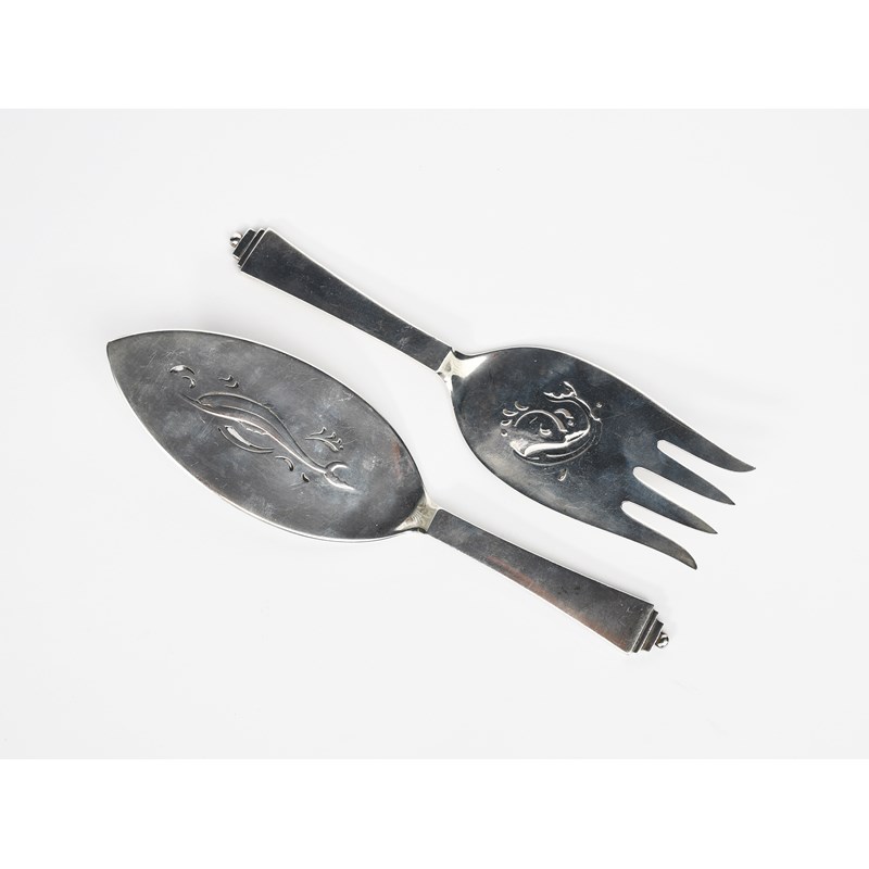 A pair of Georg Jensen Pyramid silver fish servers designed by Harald Nielsen, each blade pierced