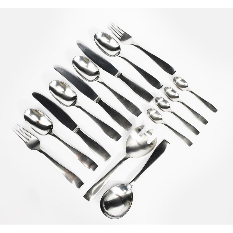 A Georg Jensen stainless steel cutlery service, comprising; six dinner knives, forks and spoons, six dessert spoons, six lunch forks and knives, six fish knives and forks, six teaspoons, two serving spoons and a fork, stamped marks, 20cm. long (serving spoons), (57)