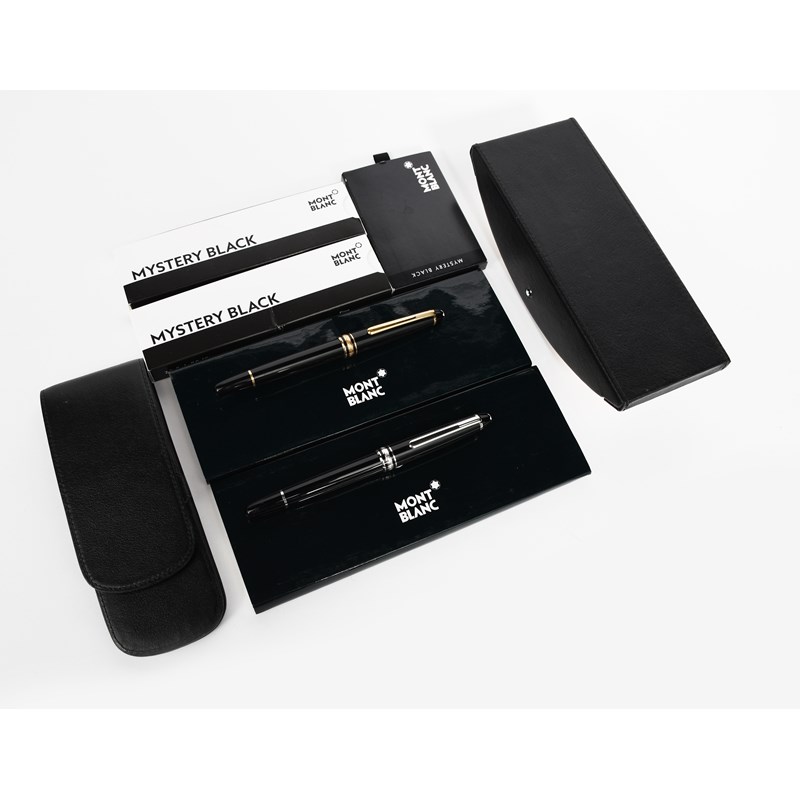 A Mont Blanc Meisterstuck fountain pen and ball pen, with Mont Blanc leather desk blotter, pen case, replacement cartridges and blotter paper, 13.5cm. long (fountain pen), (9)