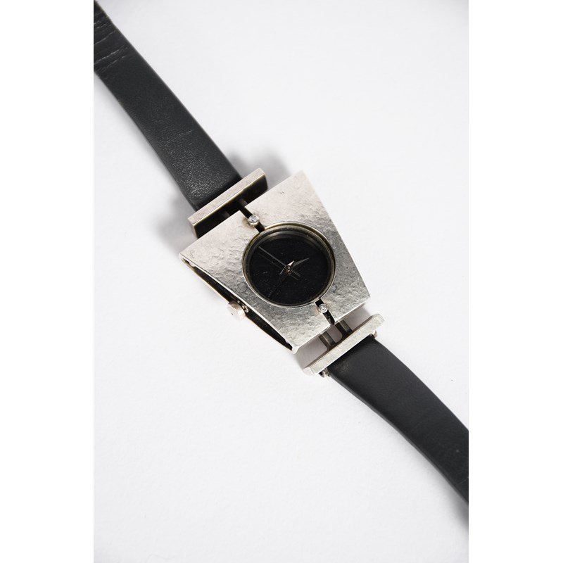 A silver and diamond watch by Louise Parry, hammered silver case, black rhodium plated dial