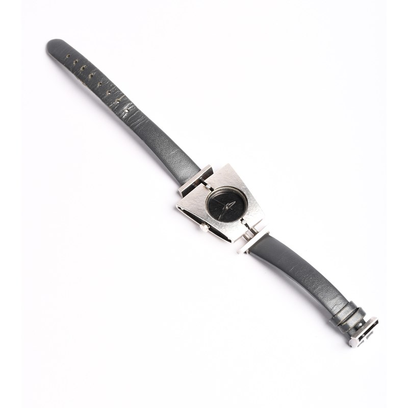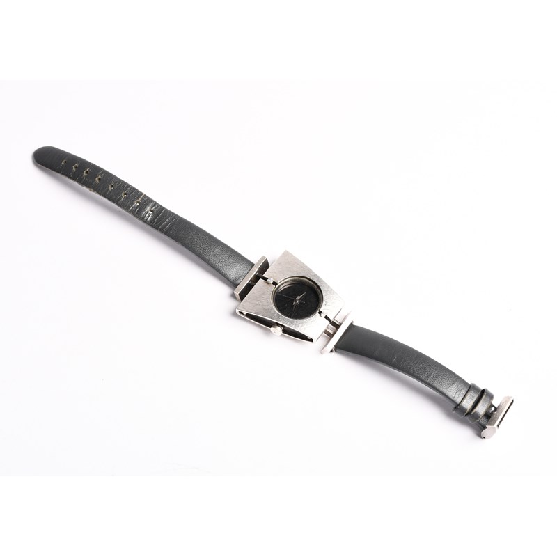 A silver and diamond watch by Louise Parry, hammered silver case, black rhodium plated dial, grey leather strap, signed to reverse, 3.3cm long