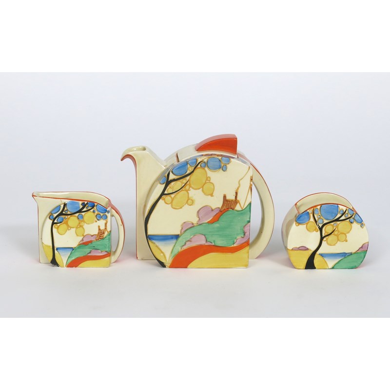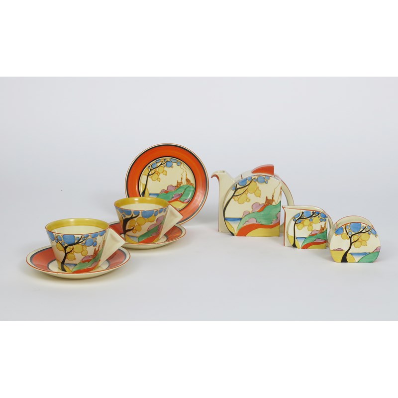 'Orange Secrets' a Clarice Cliff Fantasque Bizarre Stamford tea for two, painted in colours, comprising teapot and cover, milk-jug and sugar basin, two cups, saucers and a side plate printed factory marks, small chip to top rim of one cup, 12cm. high (teapot), (9)