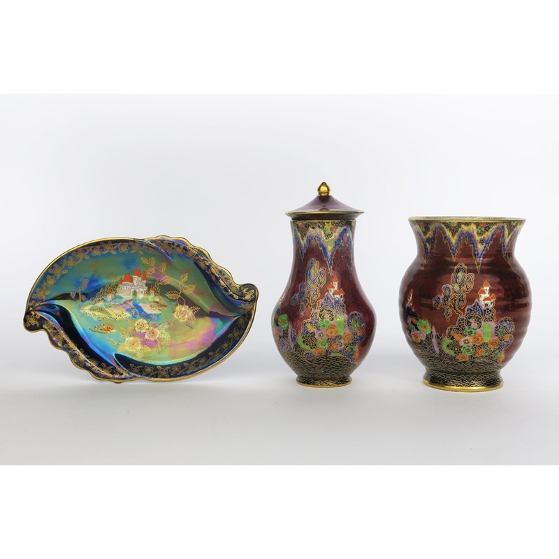 'Fairy Castle' a Fielding's Crown Devon vase designed by Enoch Boulton, pattern no.2405, shouldered form, printed and painted in colours and gilt on a red lustre ground, a Crown Devon Fairy Castle vase and cover and a Crown Devon leaf shaped dish similar on a blue lustre ground, printed and painted marks, 15.5cm. high (4)