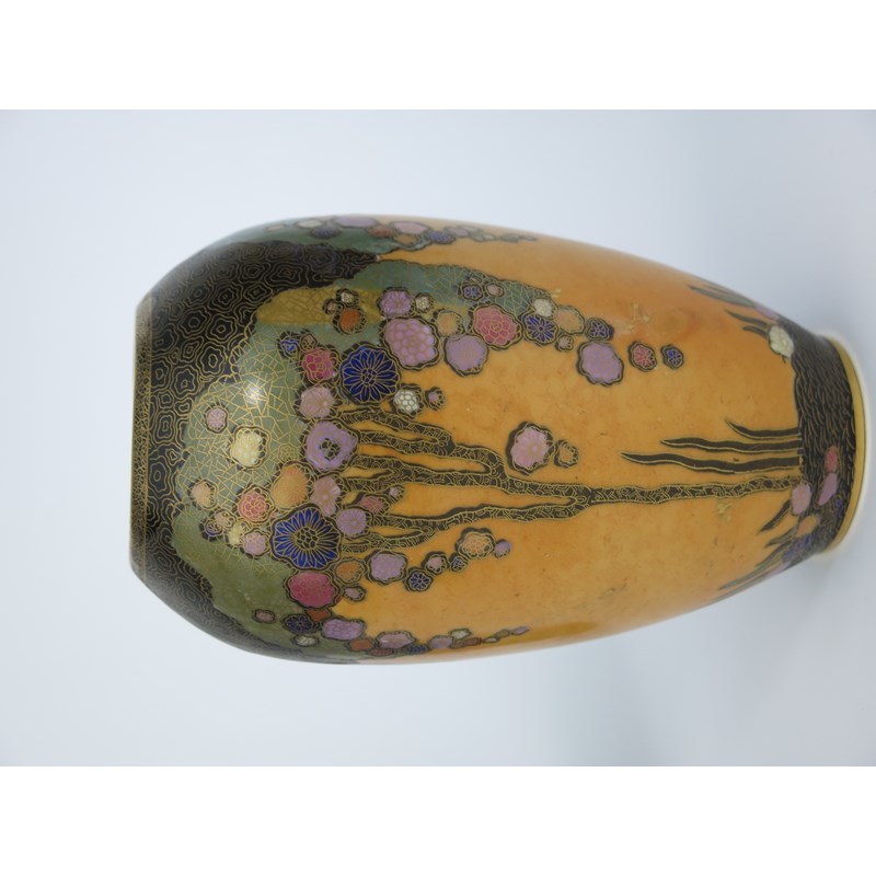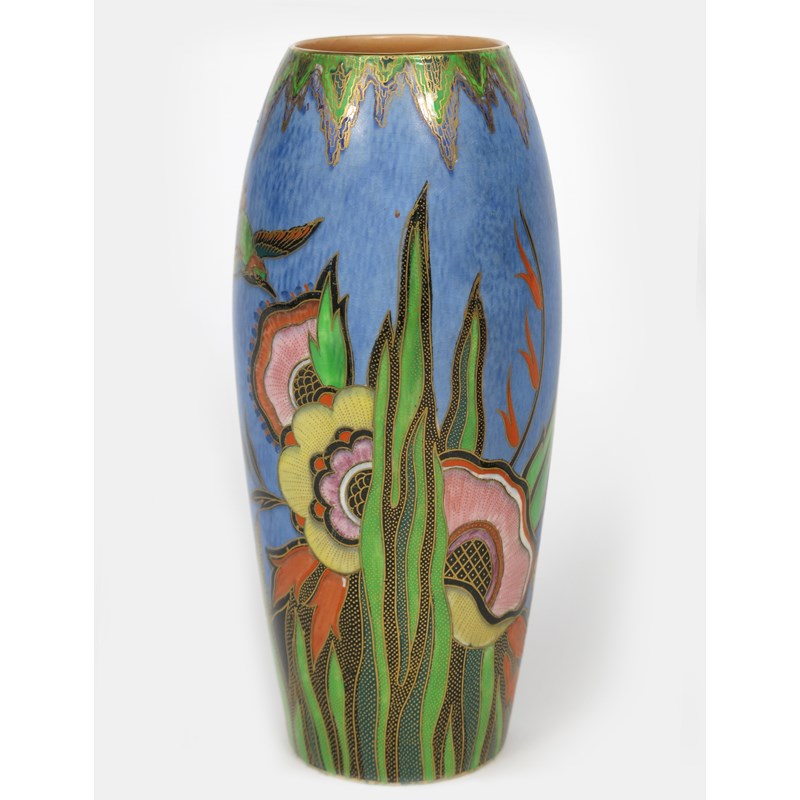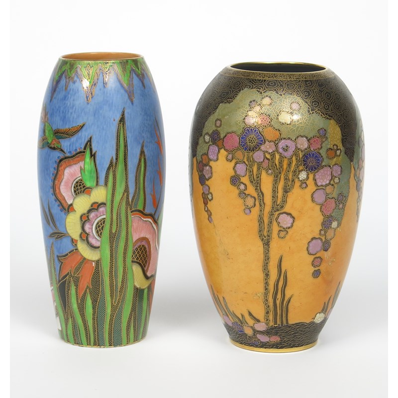A Fielding's Crown Devon vase, pattern no.2208, shouldered cylinder form, printed and painted with a bird flying past large stylised flowers and foliage, and another Crown Devon vase pattern no.2674, printed and painted marks, stress lines, 23cm. high, (2)