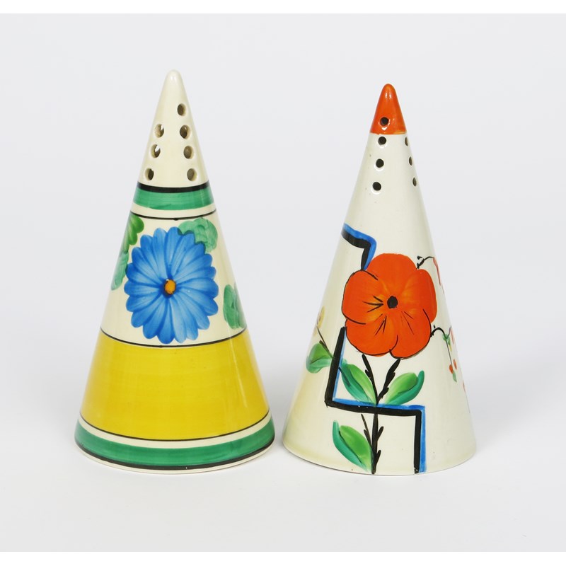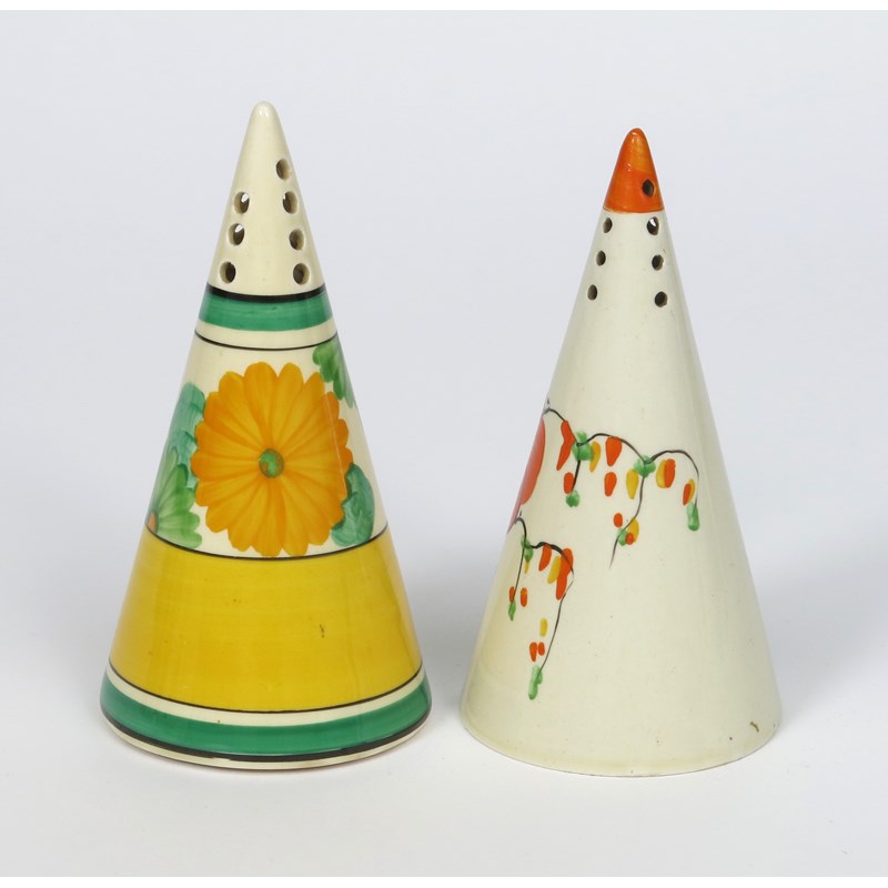'Sun-gay' a Clarice Cliff Bizarre Conical sugar sifter, painted in colours and a Honeyglaze Conical sugar sifter printed factory marks, 14cm. high, (2)