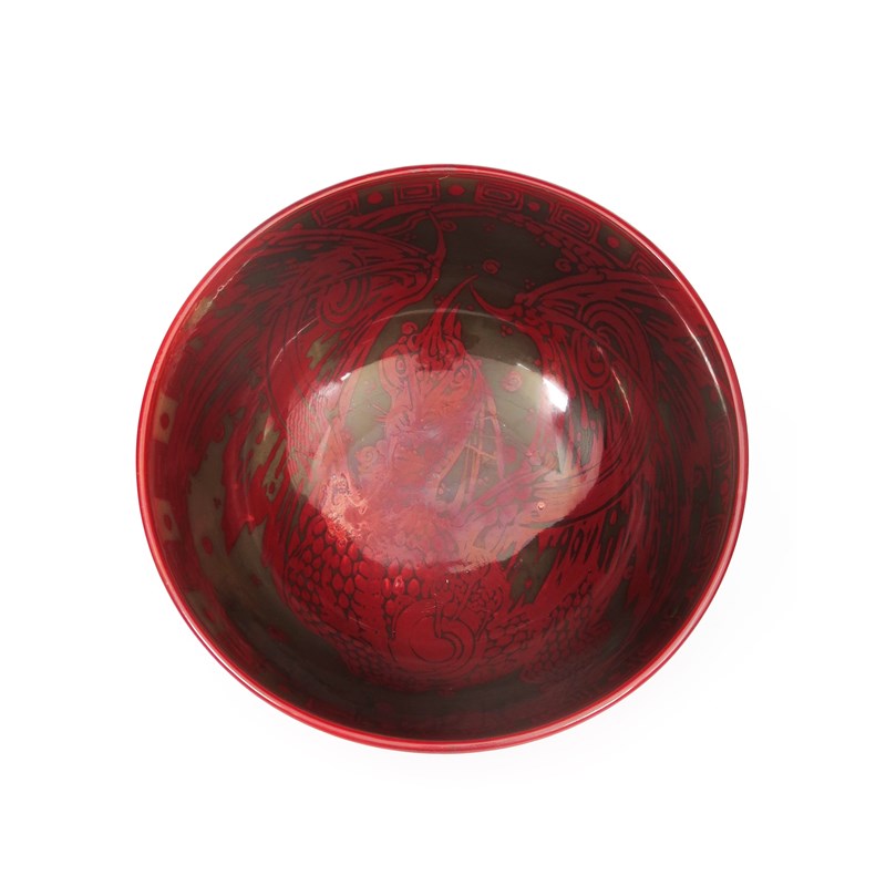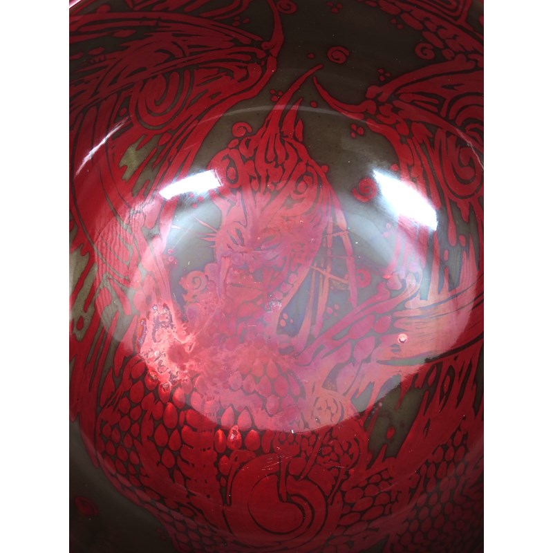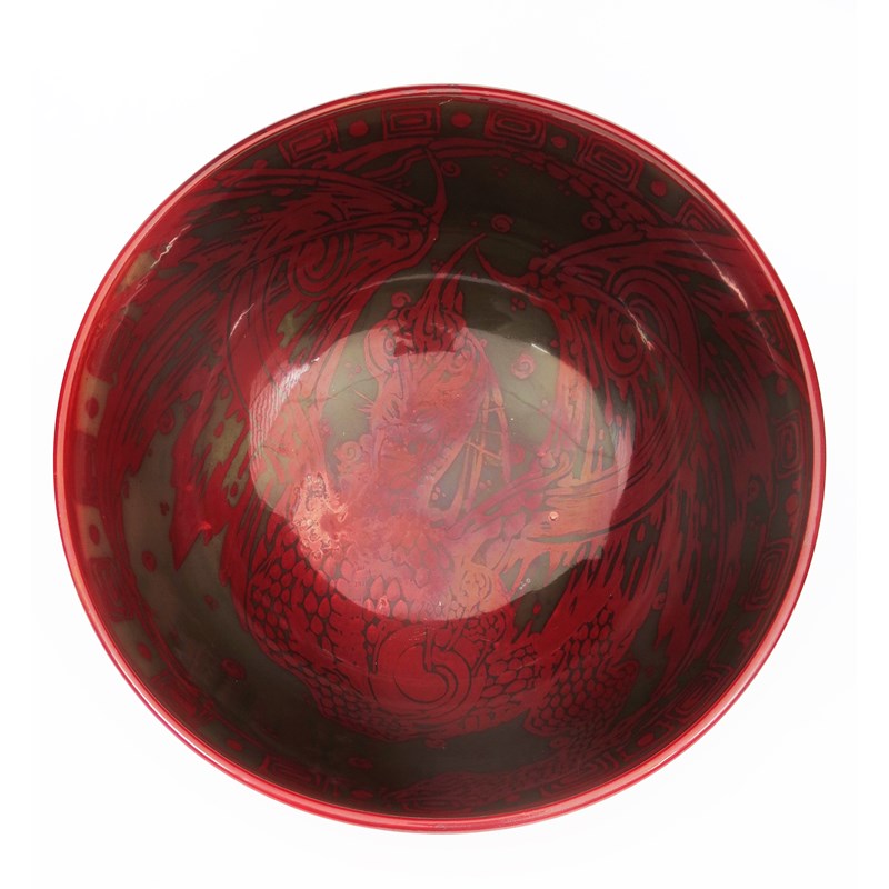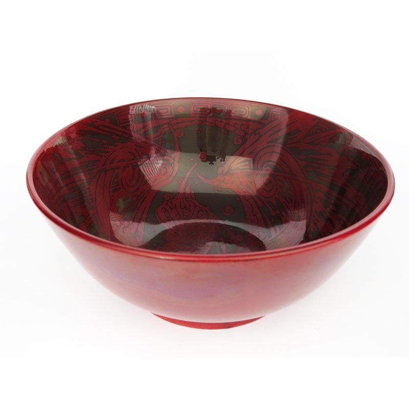 A large Bernard Moore flambe bowl by R R Tomlinson, internally painted with a ferocious dragon looking directly out, in red flambe on a smoked ground, the exterior glazed flambe red, painted Bernard Moore and artist monogram, impressed marks, 36cm. diam.
