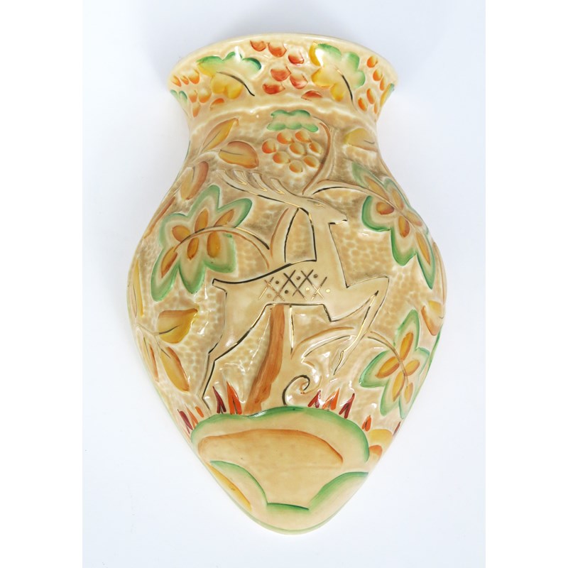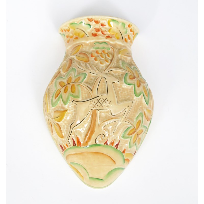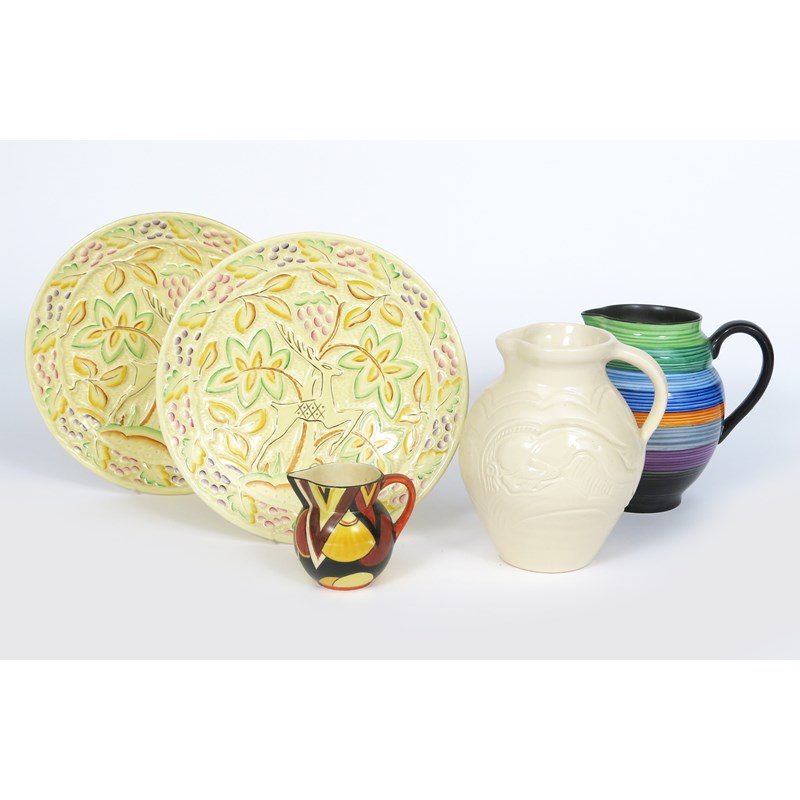 A Susie Cooper Carved Ware jug, ovoid, incised with a leaping ram to either side, covered in a cream glaze, a pair of Crown Devon Embossed Stag wall plaques modelled in low relief with a deer amongst stylised foliage, a wall pocket similar, a Burleigh Ware vase by Charlotte Rhead, model no.4497,. Carlton Ware banded jug and a collection of ceramics, incised mark, 21.cm. high, (17)