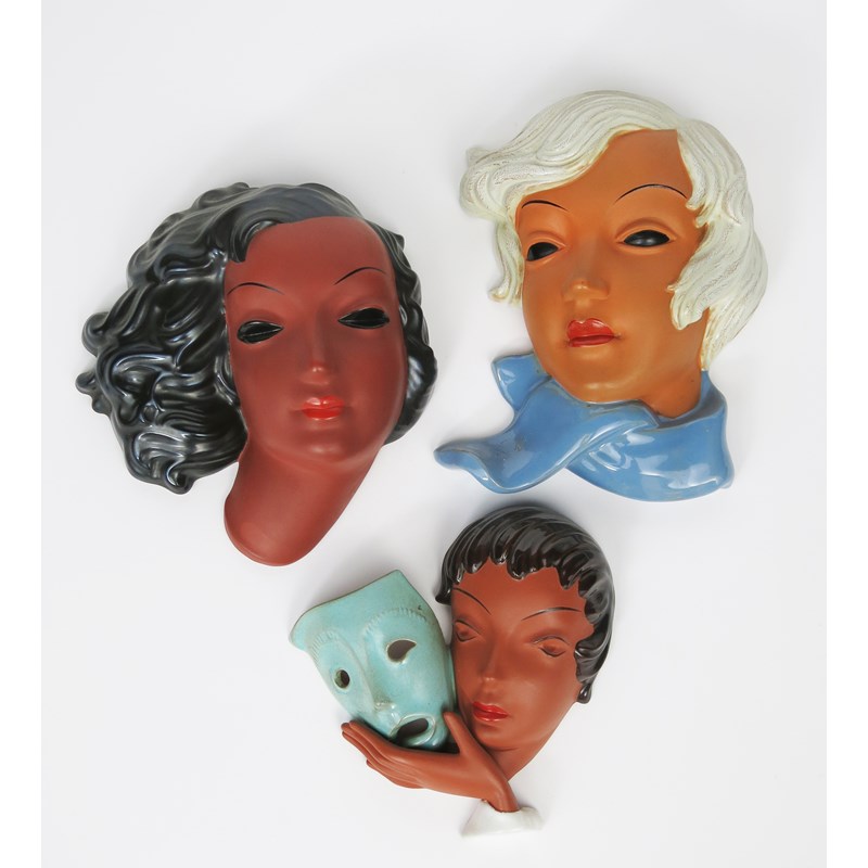 A small Goldscheider Pottery wall mask of a woman holding a mask, model no.8935, glazed in colours a Goldscheider wall mask of a woman with white hair blowing in the wing and another of a woman with black hair, printed West German marks, impressed numbers, original paper label to main, 21.8cm. high (smallest), (3)