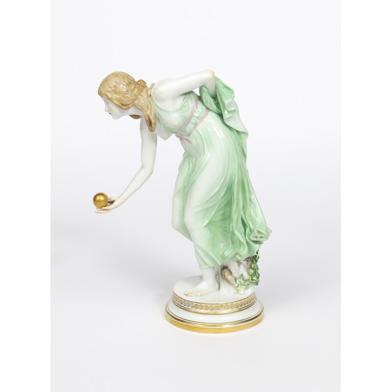 A Meissen porcelain model of a young lady bowling designed by Walter Schott, modelled in green dress, bending to bowl a golden ball, on circular base, in colours, highlighted in gilt, blue cross swords marks and impressed marks, professionally restored bowling hand, 29.5cm. high