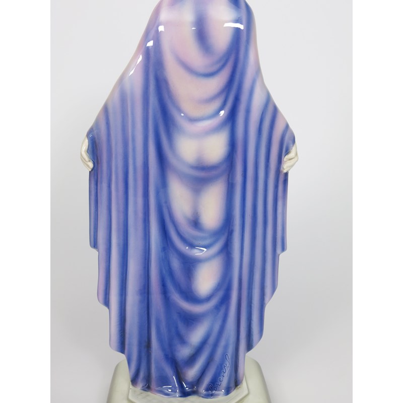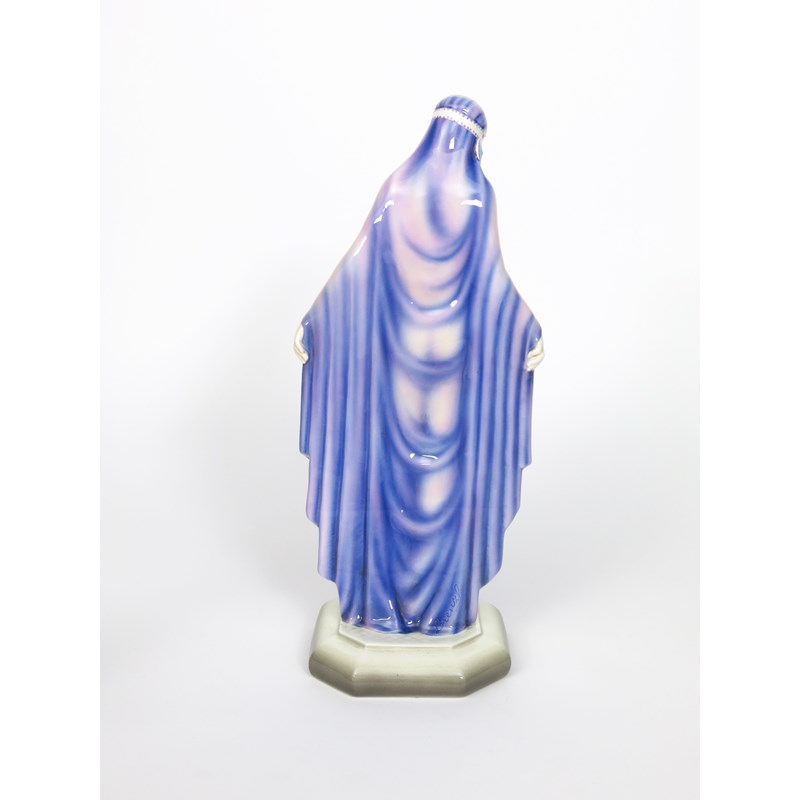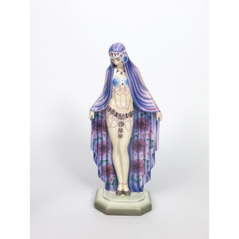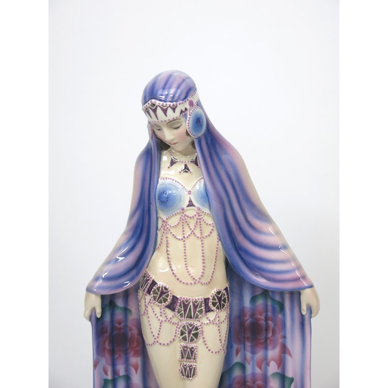A large Goldscheider Pottery bust of woman designed by Josef Lorenzl, model no.5927, modelled standing in exotic costume, headdress and purple cape, on domed octagonal base, Impressed factory marks, printed marks and impressed facsimile signature, small glaze chip to cloak rim, 44.5cm. high
