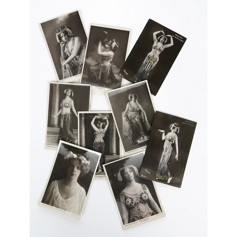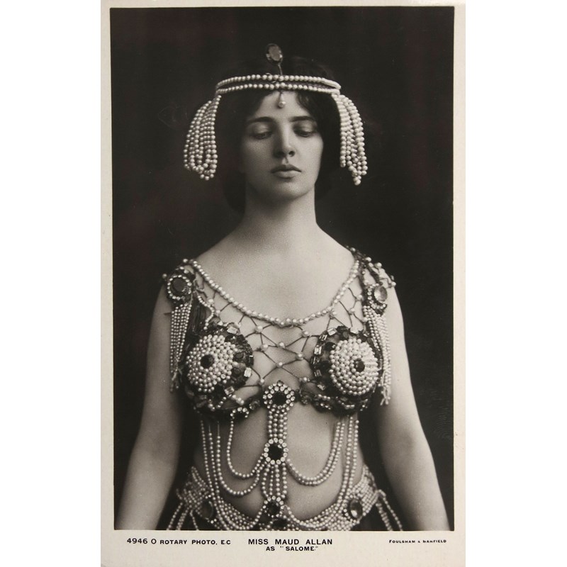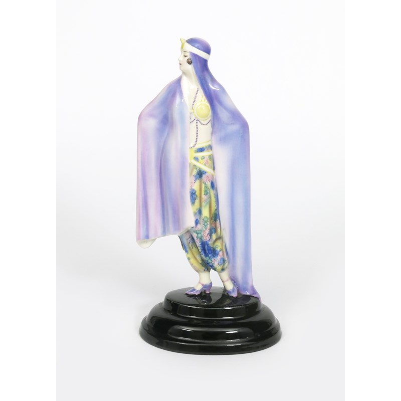 A Goldscheider Pottery model The Egyptian Dancer designed by Josef Lorenzl, model no.5281, modelled standing in pantaloons and a purple cloak, on stepped oval base, and eight photographic postcards depicting the dancer Miss Maud Adams in exotic Egyptianesque costume, impressed marks and printed Goldscheider mark and impressed Lorenzl facsimile signature, 28.5cm. high