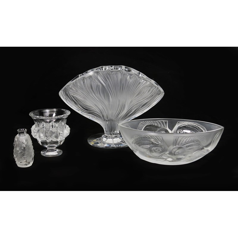A modern Lalique clear and frosted glass bowl, elliptical section, moulded in relief with stylised fish, a modern Lalique fan shaped vase, a modern Lalique 'Dampierre' urn shaped vase and a small Lalique scent bottle, etched Lalique France 29cm. wide, (4)