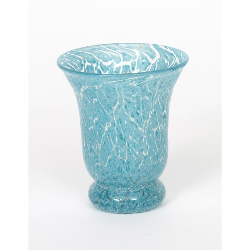 A Moncrieff's Monart Ware miniature Cloisonne glass vase, footed, flaring cylindrical form, clear glass surface decorated with crackled pale blue with white highlights, unsigned, 9.5cm. high