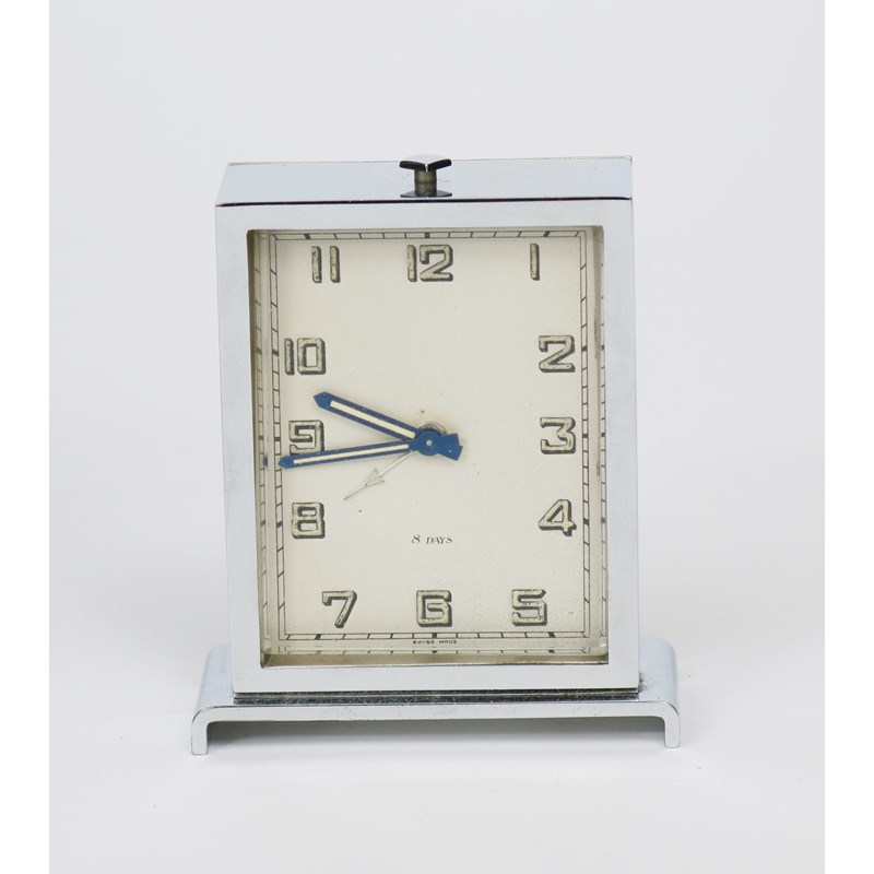 An Art Deco chrome travelling timepiece in original fitted case retailed by Harrods, rectangular form with Swiss 8 day movement, Arabic numerals, with silk-lined case stamped Harrods London, clock unmarked, 9cm. high, 7.5cm wide.
