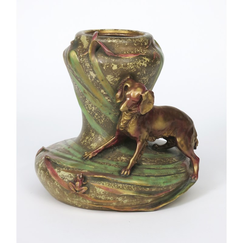 An Art Nouveau Amphora Pottery vase, model no.4115, compressed form with flaring neck, modelled with a setter dog looking at a frog, glazed in colours, highlighted in gilt, impressed marks, professional restoration, 26cm. high