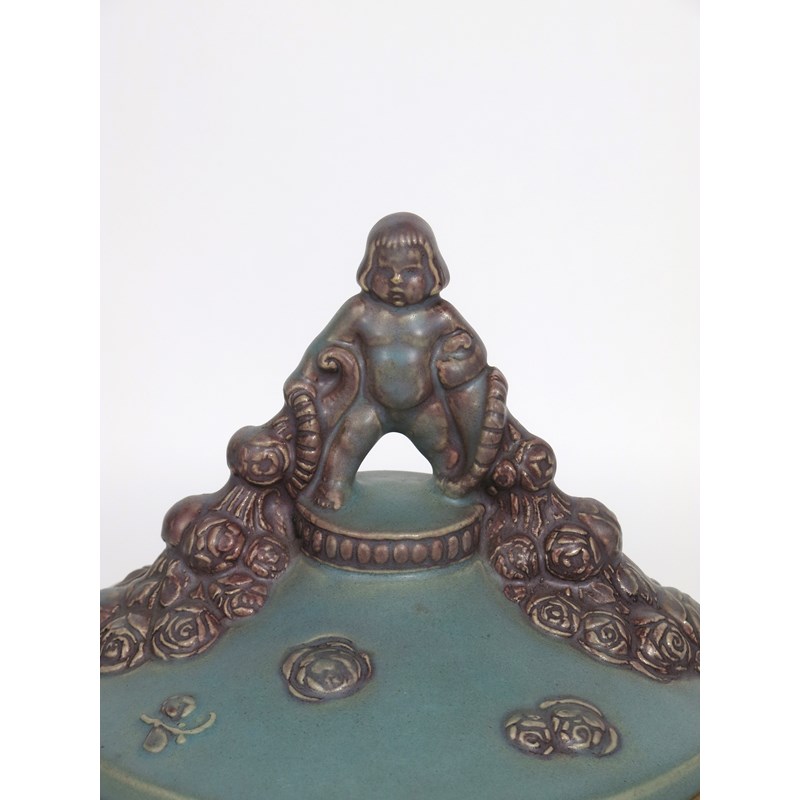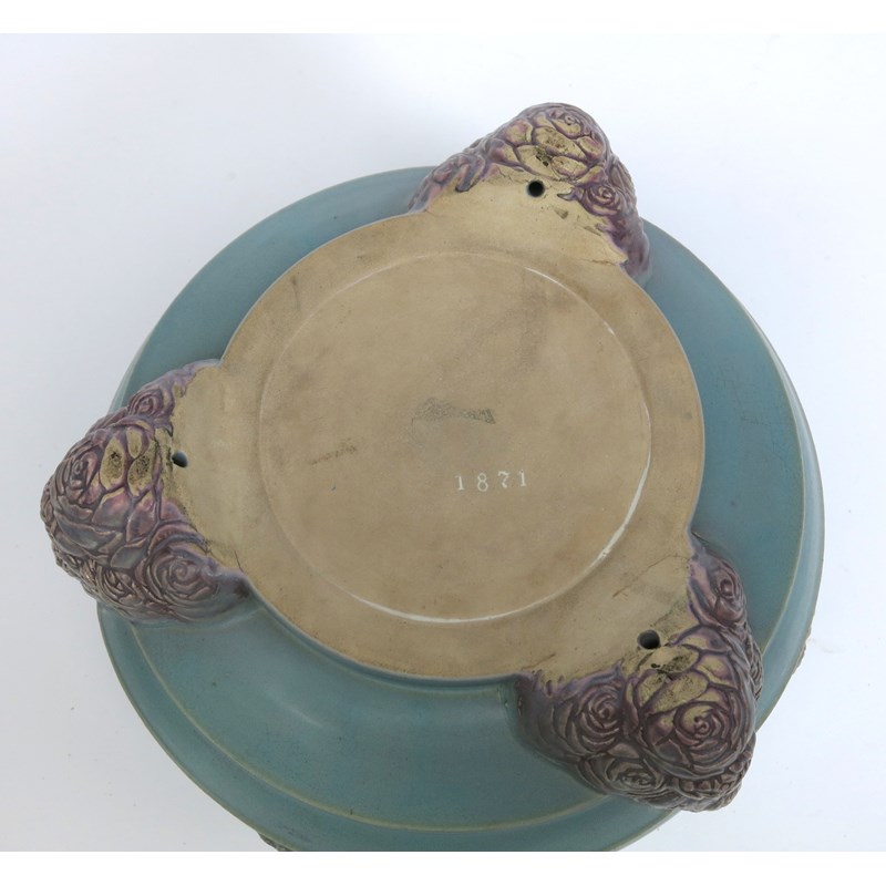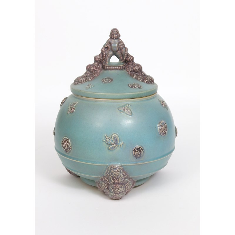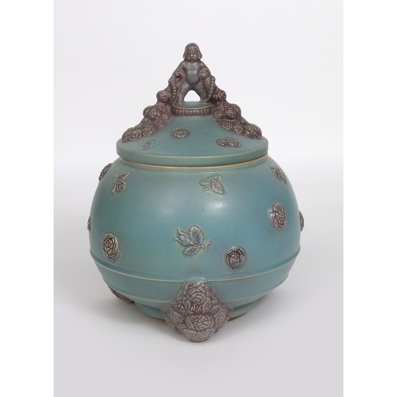 A German stoneware punch bowl and cover probably R Merkelbach, the design attributed to Carl Klimt, model no.1871, the ovoid body on three feet cast with roses and foliage, the body applied with foliate sprays and rose flowerheads, the cover with a cherub finial holding two floral cornucopia, spilling rose flower buds and leaves, glazed purple on a matt sky blue ground impressed 1871 to base, 34cm. high, (2)