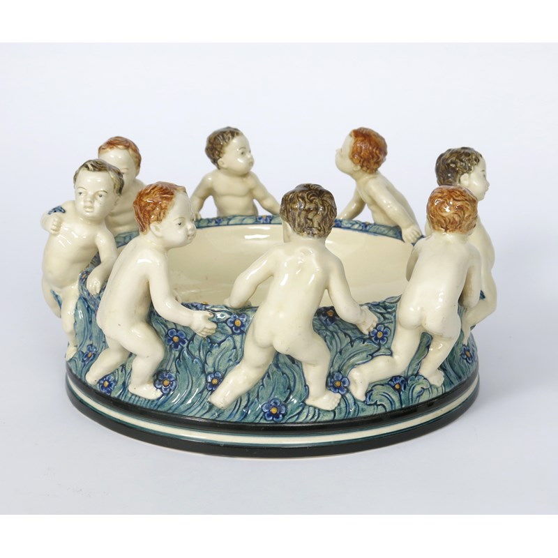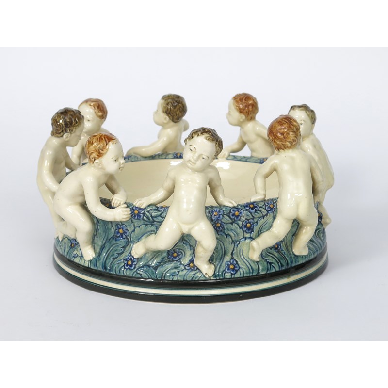 A Kahlsruhe Majolika Schale Kinderreigen centrepiece designed by Wilhelm Sus, cast as eight naked putto forming a ring around a flower encrusted bowl, glazed in shades of brown, blue, green and yellow, impressed marks, professional restoration, 33cm. diam.