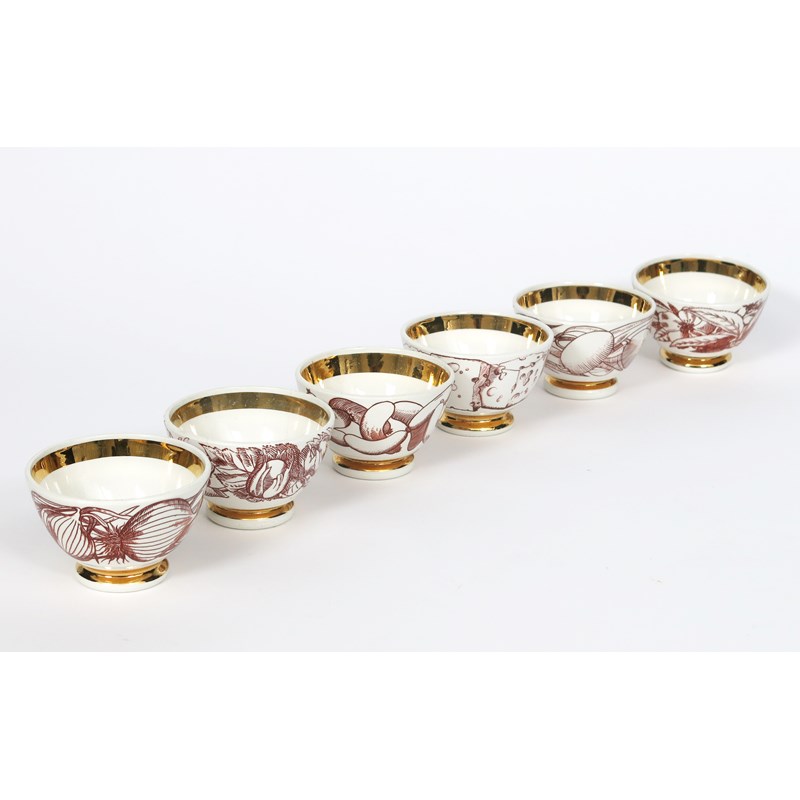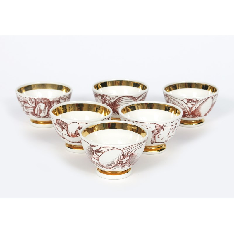 A set of six Fornasetti pottery tea bowls, each printed in sepia with food ingredients, highlighted in gilt, printed factory marks, hairline crack to one, 5cm. high (6)