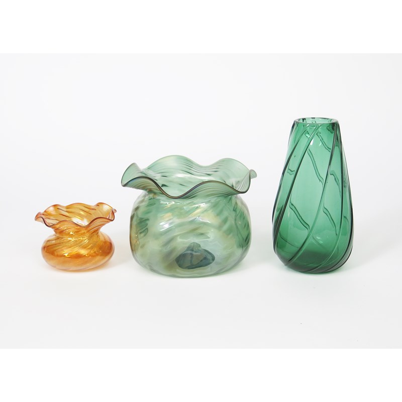 An Art Nouveau Thomas Webb iridescent green glass vase, the dimpled square body with everted fluted rim, green glass with surface iridescence, a smaller Webb Iris vase with golden orange iridescence and a green glass vase with vertical ribs the design attributed to James Powell, Whitefriars unmarked, 14cm. high (3)