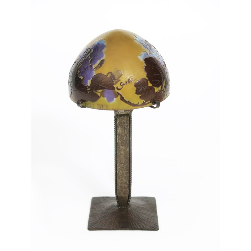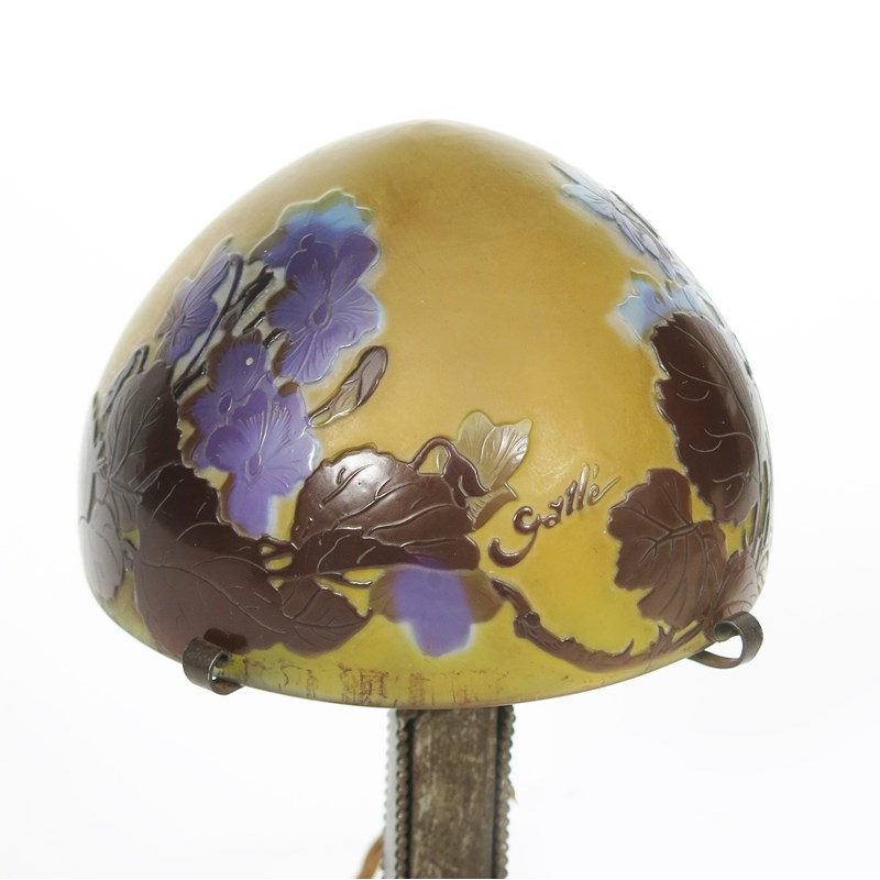 An Art Nouveau Galle cameo glass shade on patinated iron base, the base in the manner of Edgar Brandt, square section, with textured form and applied rope borders, the glass shade decorated with violet flowers cameo Galle signature to shade 26cm. high