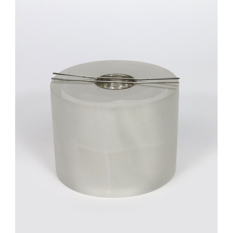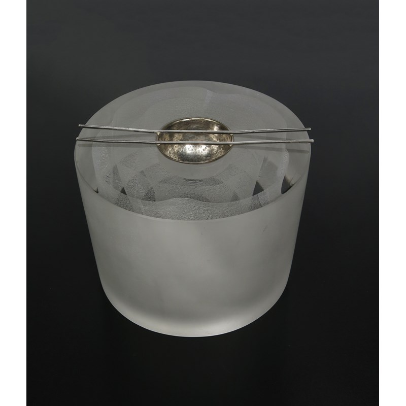 A glass and silver sculpture by Laura diaz de Santillana, dated 1998 conceived in an edition of five, cylindrical drum form internally decorated with frosted waved vertical planes, the exterior frosted, the central aperture with silver bowl, etched signature, date and number 2/5, silver stamped 925, 12cm. high, (2)